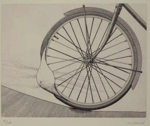 Malaval. Gravure. Sans titre (roue de bicyclette). Eau-forte et aqua-tinte en rose pâle sur Arche. Signée et numérotée 32/100. Format 51 x 67 cm