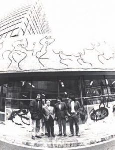 Miro. Intervention du peintre en situation à Barcelone les 27 et 28 avril 1969. Il s’agissait de la création d’une pièce d'art collective et éphémère, et de la démystification de l'artiste, dans l'esprit de l'Arte Povera. Miró achoisi quatre