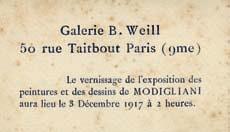 Modigliani. Peintures et dessins. Carton d'invitation, 1917. Au vernissage de l'exposition de peintures et dessins galerie B. Weill le 3 décembre 1917. Rare document.