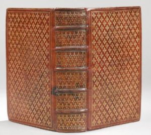 petit in-8, maroquin rouge (deuxième moitié 18e siècle), plats et dos à nerfs entièrement fleurdelisés de fers dorés, filets d'encadrement, tranches dorées (petit fente vers la coiffe en pied et à un nerf ).