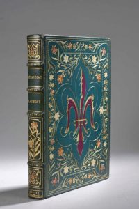 in-4, maroquin vert orné d'un grand décor floral mosaïqué sur les deux plats, avec au centre une fleur de lys, dos mosaïqué à nerfs. Large guirlande florale dorée d'encadrement intérieur, doublé de maroquin orange, intérieur du premier plat est encastré un médaillon de cuir blanc, illustrant une vignette du livre, double garde moire et papier, tête dorée, non rogné, étui fleurdelisé, bordé (superbe reliure non signée).