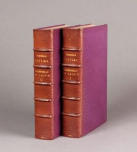 deux forts volumes in- 8, maroquin violet (dos passé), filets dorés et bande de maroquin vert sur contre plat, garde de moire violette, couverture et dos, tranches dorées sur témoins, étui bordé.