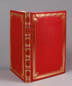 grand in-8, maroquin rouge orné sur les plats de huit filets dorés d'encadrement dont un en pointillé fleurons aux angles en forme de fleurs, dos à nerfs orné de même, filets sur coupe, filets et dentelles dorés contre plat, tranches dorées sur témoins, couverture en double état et dos illustré en noir et en couleurs, étui bordé.