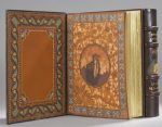 Tous les contres plats richement ornés de grandes frises d'encadrement mosaïqués de cuirs polychromes, gardes de soie imprimée en couleurs reprenant des motifs de l'illustration.