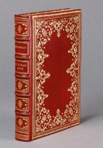 in-12, maroquin rouge d'époque orné de fers dorés, filets et rinceaux feuillagés sur les plats, dentelle fleurie et filets dorés sur contre plat, dos orné à nerfs, filet sur coupe, couverture et dos, tranches dorées sur témoins, étui bordé.