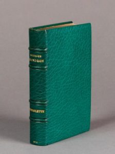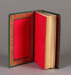 in-12, maroquin vert, filet sur coupe, large frise dorée sur contre plat, doublé et garde de tissu moiré rouge, couverture et dos, tranches dorées sur témoins, chemise demi maroquin en long à rabat, étui bordé.