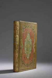 grand in-8, percaline mosaïquée polychrome, entièrement dorée d'un décor de parterre de rinceaux et rocailles.