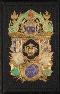 grand in-8, percaline noire mosaïquée polychrome et fers spéciaux dorés, blasons dans un décor architectural, dos assorti, fers dorés, armoiries sur deuxième plat, tranches dorées.