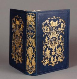 fort grand in-8, percaline bleue ornée de fers spéciaux dorés, grand décor sur les deux plats, personnages et scènes de genres entourés de volutes, illustrant différentes pièces de Molière, dos assorti.