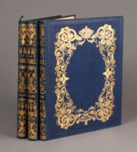 trois volumes in-4, percaline bleue ornée de fers dorés, volutes de rocailles encadrant les plats avec couronne royale et dos. 108-82 et