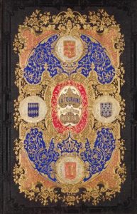 grand in-8, percaline, très beau décor doré et mosaïqué polychrome, Jeanne-d' Arc terrassant un lion, dos très orné, château fort en médaillon, grande rosace sur deuxième plat, tranches dorées. 614 pp.
