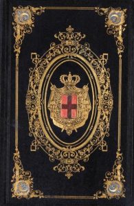 grand in-8, percaline ornée de fers dorés et polychrome, grand cadre, fleurons aux angles et au centre grand médaillon aux armes de la ville, dos assorti, très beau fleuron avec écusson sur deuxième plat, tranches dorées.