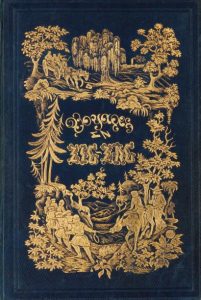 grand in-8, percaline bleu nuit, grand décor de fers dorés, voyageurs dans paysages, dos illustré de personnages, vignette illustrée, jeune homme à l'étude sur deuxième plat, tête dorée (quelques rousseurs).