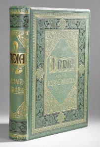 Superbe cartonnage vert chagriné à bord biseauté, titre encadré d'un décor de fers dorés et à froid et dos à motifs Hindous.