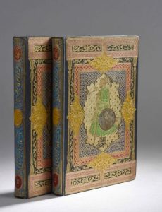 deux grands volumes in-8, percaline gaufrée noire ornée de fers spéciaux dorés et mosaïqués polychrome, Radjah en habit d'apparat dans un décor orné de motifs stylisés à la manière géométrique des tapis d'Orient, titre au dos stylisé, musicien représenté dans une niche décorative sur deuxième plat, tranches dorées (infimes restaurations vers les coiffes).