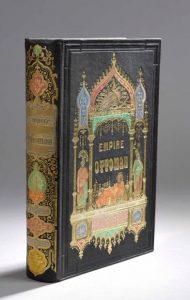 grand in-8, percaline gaufrée noire, fers dorés spéciaux et mosaïqués polychromes, personnages ottomans dans un très beau décor architectural mauresque, dos assorti, vignette dorée au centre du deuxième plat, tranches dorées (une petite fente vers la coiffe).