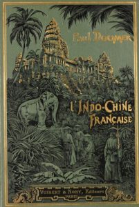 Cartonnage vert d'éditeur orné de fers dorés et noir et dos, éléphant dans forêt et devant un temple cambodgien et indigènes, tranches dorées.