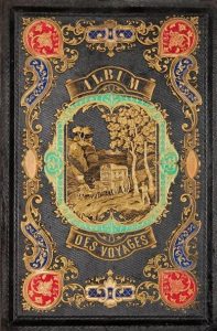 in-4, cartonnage de percaline noire, décor mosaïqué polychrome et doré orné en son centre d'un grand médaillon figurant une diligence attelée dans paysage, titre sur premier plat, personnage à cheval sur deuxième plat, dos assorti, tranches dorées.