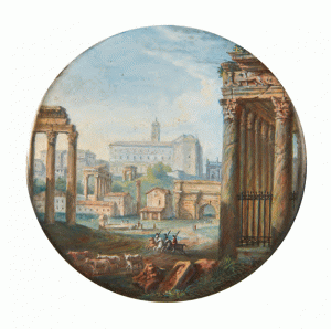 ÉCOLE FRANÇAISE de la fin du XVIIIe siècle. Vue du forum romain prise à l'angle du portique du temple d'Antonin et Faustine Gouache de forme ronde.