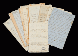Ens. 77 p. in-12 et in-8 (dimensions diverses), suscriptions et 3 enveloppes.