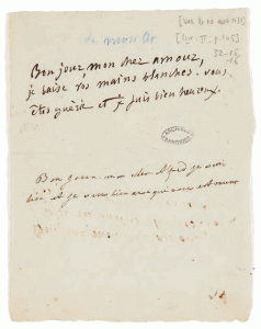 "Bonjour, mon cher amour, je baise vos mains blanches.