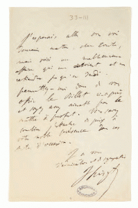 Une p. in-8 (20,2 x 12 cm). Seule lettre de Franz Liszt à Alfred de Vigny connue à ce jour. C'est, avec la partition autographe inscrite par le célèbre pianiste et compositeur dans l'album amicorum des Vigny, une des seules traces écrites directes de l'amitié entre les deux hommes qui s'étaient connus vraisemblablement en 1833 et se rencontrèrent souvent grâce à Hector Berlioz et Marie d'Agoult.