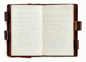 In-32 (9,8 x 6,4 cm), chagrin à grain écrasé aubergine, dos lisse, contre-gardes et gardes de satin rayé bleu et rouge à un soufflet, tranches dorées, gaine à crayon (Delarue).