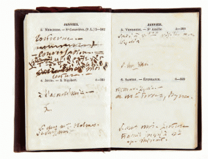Agenda d'Alfred de Vigny pour l'année 1855, contenant des notes au crayon noir et à l'encre sur 26 pages préimprimées et vierges :