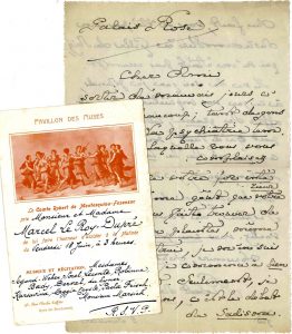 «Merci pour les jolies fleurs. Je suis tout à mes préparatifs...» [Juin 1909]. unvitation à une matinée de musique et de récitations au Pavillon des Suses... 3 janvier 1910.