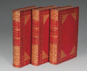 6 parties en 3 volumes in-8°, maroquin rouge à grain long, large décor d'encadrement de filets dorés ornant les plats, avec fleurons et écoinçons aux angles, dos à nerfs orné, tranches dorées, dentelle intérieure, gardes de moire violine (Rel. P. Bozérian Jeune).