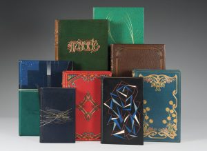 In-4°, maroquin brun, plats ornés d'un décor d'encadrement mosaïqué, dos à nerfs orné d'un même décor, tranches dorées sur témoins, contreplats et gardes de soie dorée brodée à décor floral géométrique, couverture conservée, étui (Marius Michel).