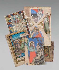 [Manuscrits Enluminés]. Deux miniatures sur un feuillet en peau de vélin provenant d’un livre d’heures manuscrit de la fin du xve siècle (98 x 161 mm).