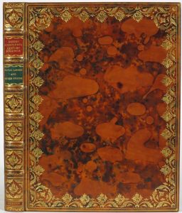 Large in-4°; 102 plates. Bound by Anker Kyster : marbled calf, boards decorated in gilt with a large roll-stamp and fillets, gilt decorated ribbed spine with red and green leather labels, gilt roll-stamps on the edges and turn ins, blue marbled egdes. In a case with a label on the upper side.