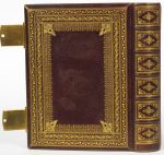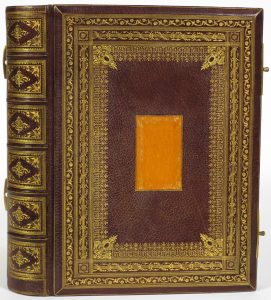 31,6 x 23,5 x 6 cm, plats ornés de plusieurs encadrements de filets et roul. fleuronnées dorés, plat sup. avec listel au centre de maroq. orange serti d'une roul. dorée, dos à nerfs entièrement fleuronné doré, fermoirs dorés.