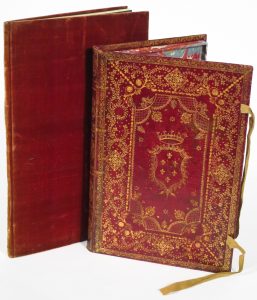 Plein maroquin rouge, plats RICHEMENT FLEURONNÉS aux petits fers de roulettes palmée ou ornées, cadres de rinceaux fleuris, cadre intérieur et fleurons d'angles, etc., sur semé d'étoiles cernant des armoiries centrales à 5 lys de France sommés d'une couronne, dos lisse fleuronné doré, lacets de fermeture en tissu moderne écru, "tranches" et doublures en carton couvert de papier marbré du 18e s. (coins émoussés, coupes us. partiellement restaurées, qqs griffures sombres).