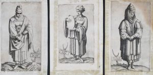 13,5 à 15,5 x 8 à 9 cm + marges, papier vergé, fixées sous passe-partouts (taches). Cavaliers espagnols, moscovites, polonais, russes, et turcs; bourgeois et bourgeoises de Berne, Biscaye, Castille, Pamplone, Santander etc.