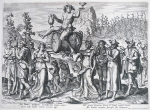 Suite complète des quatre pouvoirs triomphantes : le Vin, la Royauté, la Femme et la Vérité; chaque sujet accompagné de 4 vers en latin par Victor Ghyselinck (1543-1591).
