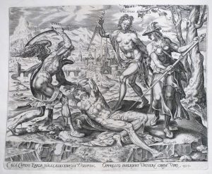4 eaux-fortes, cuv. 19,5 x 26,5 cm + bonnes marges, papier vergé filigrané (pl. 1 rognée en haut). Premier état (sur 2) de 4 planches (sur 6) figurant le triomphe de l'Amour, de la Chasteté, de la Mort et du Temps. Chaque sujet est accompagné de vers en latin par Hadrianus Junius (1511-1575).
