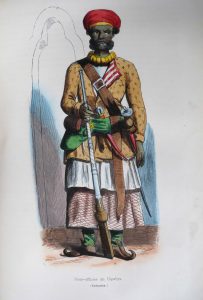 Monument de la représentation des peuples du monde au XIXe s. illustré de 4 vignettes de titre et de 210 SUPERBES PLANCHES REHAUSSÉES de couleurs chatoyantes et partiellement gommées par Duverger, L. Markaert, R. King, etc., reproduisant assez fidèlement les habitants du monde en costume traditionnel : 184 planches annoncées aux tables (pl. "Noukahiva" du vol. Océanie présente mais reliée dans le vol. Afrique-Amérique), 7 supplémentaires qu'il fallait souscrire ("Femmes de Miranda" manquante) et 11 ajoutées non signalées (pl. "Majo de Jerez" du vol. Europe présente mais reliée dans le vol. Afrique-Amérique).