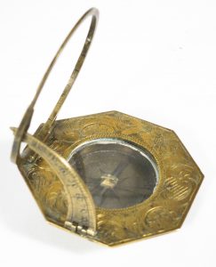 Engraved brass, 6 cm diam. Recessed compas centre with blued-iron needle beneath glazed panel, within octogonal surround engraved with floral and foliate decoration.