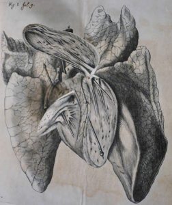 Lugduni Batavorum [ Leiden], apud Petrum Leffen & Franciscum Moyardum, 1662. In-4° : 121-[1] pp.; 10 h.-t. (incomplet des pp. 29-30, partie du titre découpée -pour retirer une mention d'app. ms.- restaurée, qqs piqûres éparses, pet. rouss. concentrées, qqs pp. lég. brunies, p. 29 en partie déreliée). Rel. hollandaise de l'époque : plein vélin à couture apparente, dos lisse titré à la plume (rares pet. défauts). ÉDITION ORIGINALE DE LA TRADUCTION faite par Florent Schuyl, sans l'autorisation de Descartes, sur une mauvaise copie du manuscrit original français, qui lui, fut seulement publié en 1664. Une autre édition parue la même année avec le nom de Moyard avant celui de Leffen dans l'adresse et une vignette de titre différente mais avec une collation identique. Illustré, la majorité gravée sur cuivre, de plus de 40 in texto, de 7 pleines pages, et de 10 planches, dont une avec système mécanique, figurant des organes dont le coeur, des squelettes, schémas, etc. Le "De homine" est considéré comme le premier ouvrage européen traitant de physiologie et fut conçu à la base comme l'appendice du "Discours de la méthode".