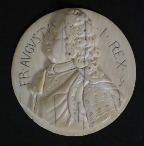 BAS-RELIEF, uniface, sur IVOIRE (diam. 5,2 cm), mention sculptée en demi-cercle au pourtour de la pièce "Fr. Augustus. I. Rex." (légers fendillements noirs dans l'ivoire).