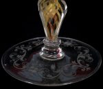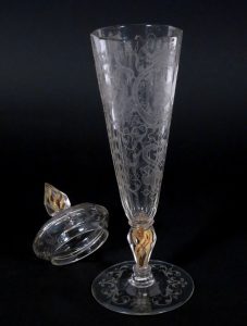 Le pied et la pointe du couvercle avec filaments de verre rouge et or, la flûte et le couvercle entièrement gravés de bouquets fleuris, oiseaux, arabesques et formes géométriques.