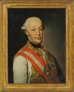 Buste de 3/4 droite, âgé d'une quarantaine d'années, perruque poudrée à marteau retenue par un ruban noir dans la nuque, collet noir, jaquette blanche et passementerie d'or, écharpe rouge et blanche de l'ordre de Marie-Thérèse passant de l'épaule droite avec bijou de la Toison d'or la surplombant, grands croix des ordres de Marie-Thérèse et de saint Étienne (fondé en 1764 par Marie-Thérèse).