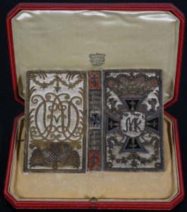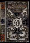 Sous écrin de cuir rouge. Plat supérieur orné d'une grande croix de l'Ordre teutonique (Charles de Lorraine en fut Grand Maître de 1761 à sa mort en 1780) brodée de soie noire, brochant sur deux aigles aux ailes éployées de Lorraine d'or et timbrée d'une couronne princière. Au centre de la croix, les initiales M.K. dont la signification n'est pas élucidée.