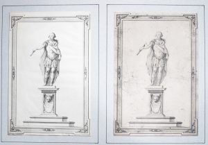 CARDON, Antoine-Alexandre (1739-1822).- Statue de Charles de Lorraine en empereur romain (autrefois érigée Place royale à Bruxelles) [d'après P. A. VERSCHAFFELT (1710-1793)]. Cuv. 23 x 17 cm + marges (la seconde rognée sur cuv.), les 2 fixées sur une même f. de support.