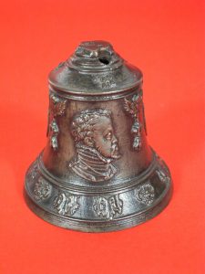 CLOCHETTE AU BUSTE DE PHILIPPE II, Roi d'Espagne. Malines, 16e siècle. Bronze,