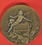 Médaille en bronze, diam. 68 mm. Avers : tête d'Orphée avec une longue chevelure bouclée couronnée de lauriers, dans sa main gauche une lyre, signé au-dessus de la lyre "L. Coudray"; Revers : personnage ailé tenant une plume de la main droite et une trompette droite de la main gauche, un cartouche au centre contenant "Maman à Jean // Exposition // 15-8-1935", en dessous un violon et son archet et une longue branche de laurier. Sur la tranche : poinçon précisant "bronze". Coudray (1864-1932) gagna le Grand Prix de Rome en 1893 avec cette médaille figurant Orphée endormant Cerbère aux sons de sa lyre.