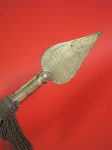 (a). bâton : 175 cm, couvert de velours rouge (entièrement râpé) fermé de clous alignés et terminé par une passementerie de fils de corde, terminé par une pique +