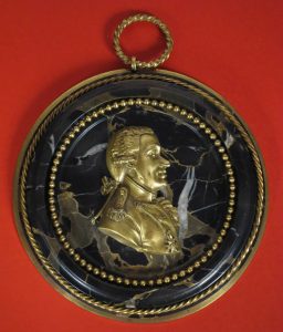 5,5 x 3,7 cm, posé dans un médaillon de marbre noir veiné de blanc, triple cerclage en bronze doré torsadé, perlé ou plein (diam. : 11 cm).
